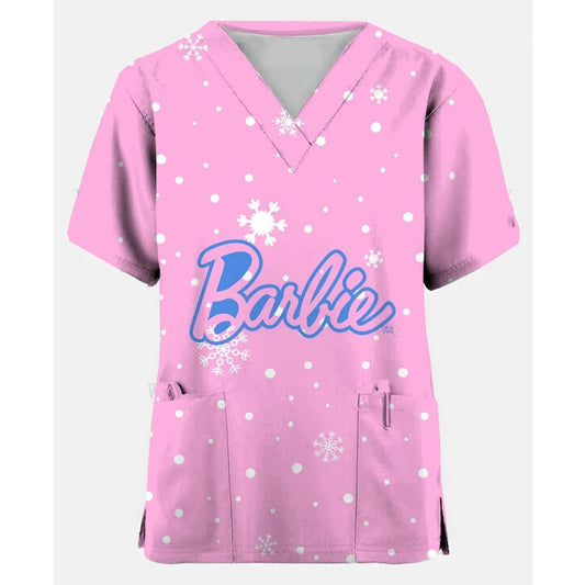 Women Medical Barbie Print Scrub Shirts Clinical V-neck Blouse Cartoon Pocket Scrubs
